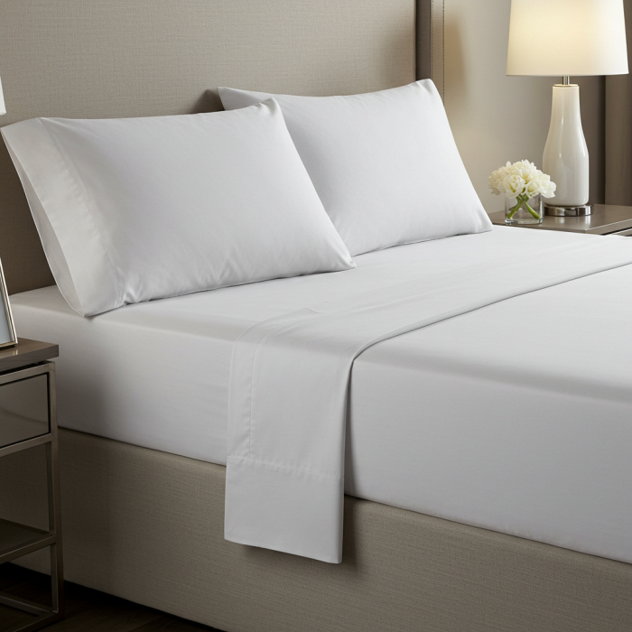 The DreamWeave Elite hotel bed sheet is made from 100% high-quality cotton, offering a soft and luxurious feel. Its durable construction ensures long-lasting use, while the neutral colors complement any room decor. Perfect for creating a cozy and inviting atmosphere for your guests