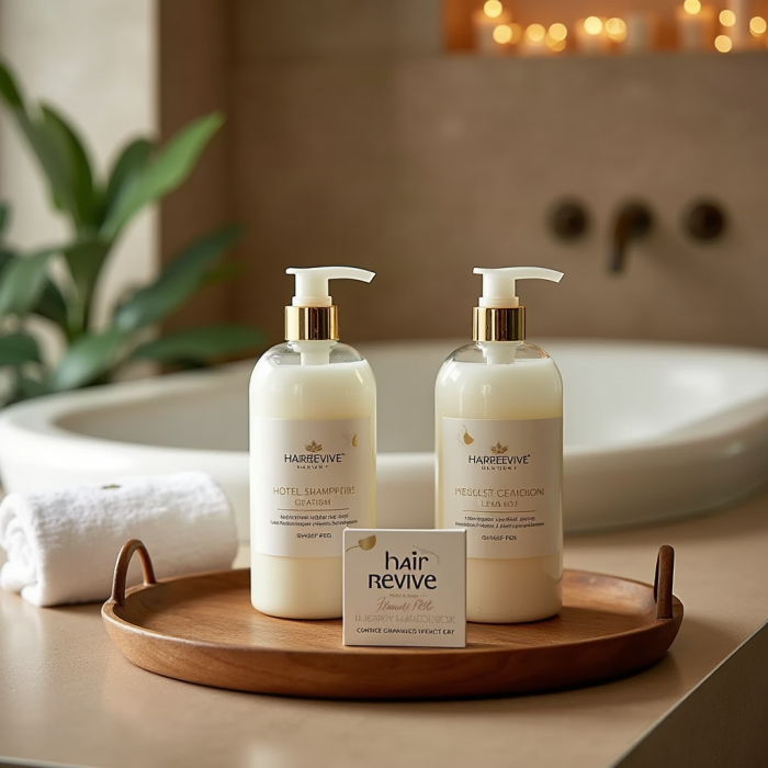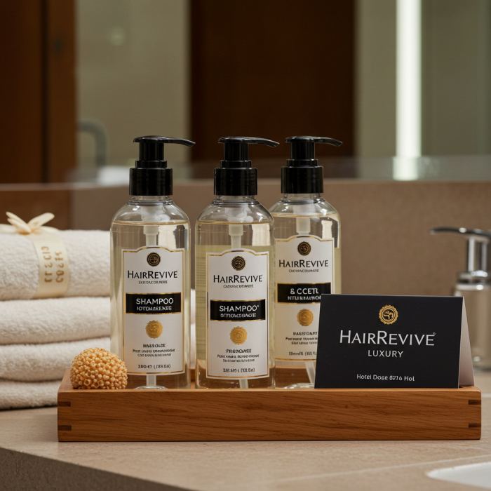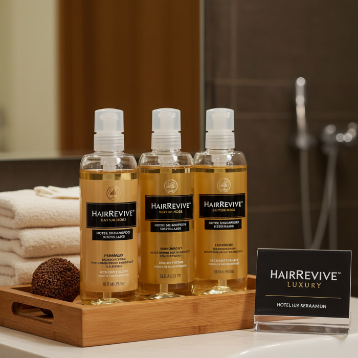 The HairRevive Luxury hotel shampoo set is formulated with natural extracts and essential oils to nourish and revitalize hair. Each bottle is elegantly designed to complement your hotel bathroom decor, providing guests with a luxurious and refreshing experience