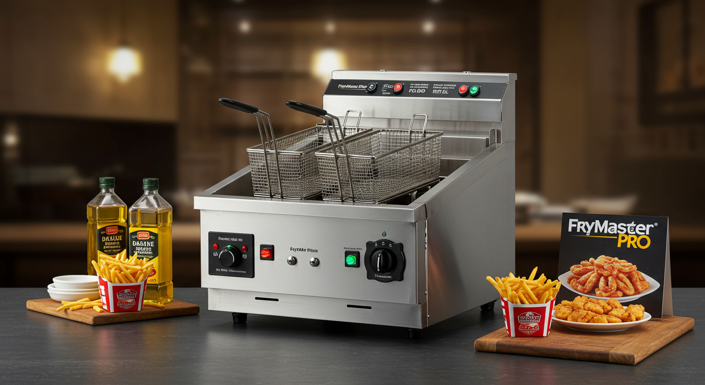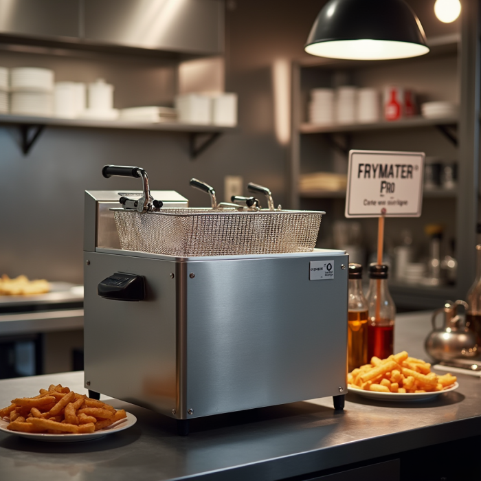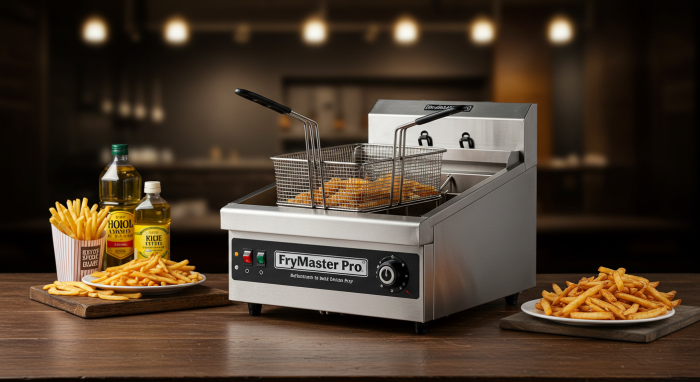 Create a professional image of the FryMaster Pro industrial fryer. The fryer should be stainless steel, with visible baskets and controls. Place it in a commercial hotel kitchen setting with soft lighting and props like fries, oil bottles, and a branded sign that says ‘FryMaster Pro.’ The background should be clean and professional, emphasizing the fryer’s precision and durability